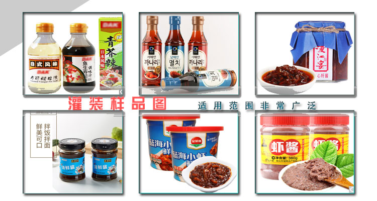 廣泛適用于液體、膏體、醬料、半流體等物料的灌裝,例如海鮮醬、海鮮汁、蟹黃醬、牛肉醬、豆豉醬、花生醬、魚子醬、糟辣椒、香菇醬、沙茶醬、酸梅醬、雞丁醬等物料的灌裝機(jī),而且有多種灌裝量可供選擇。